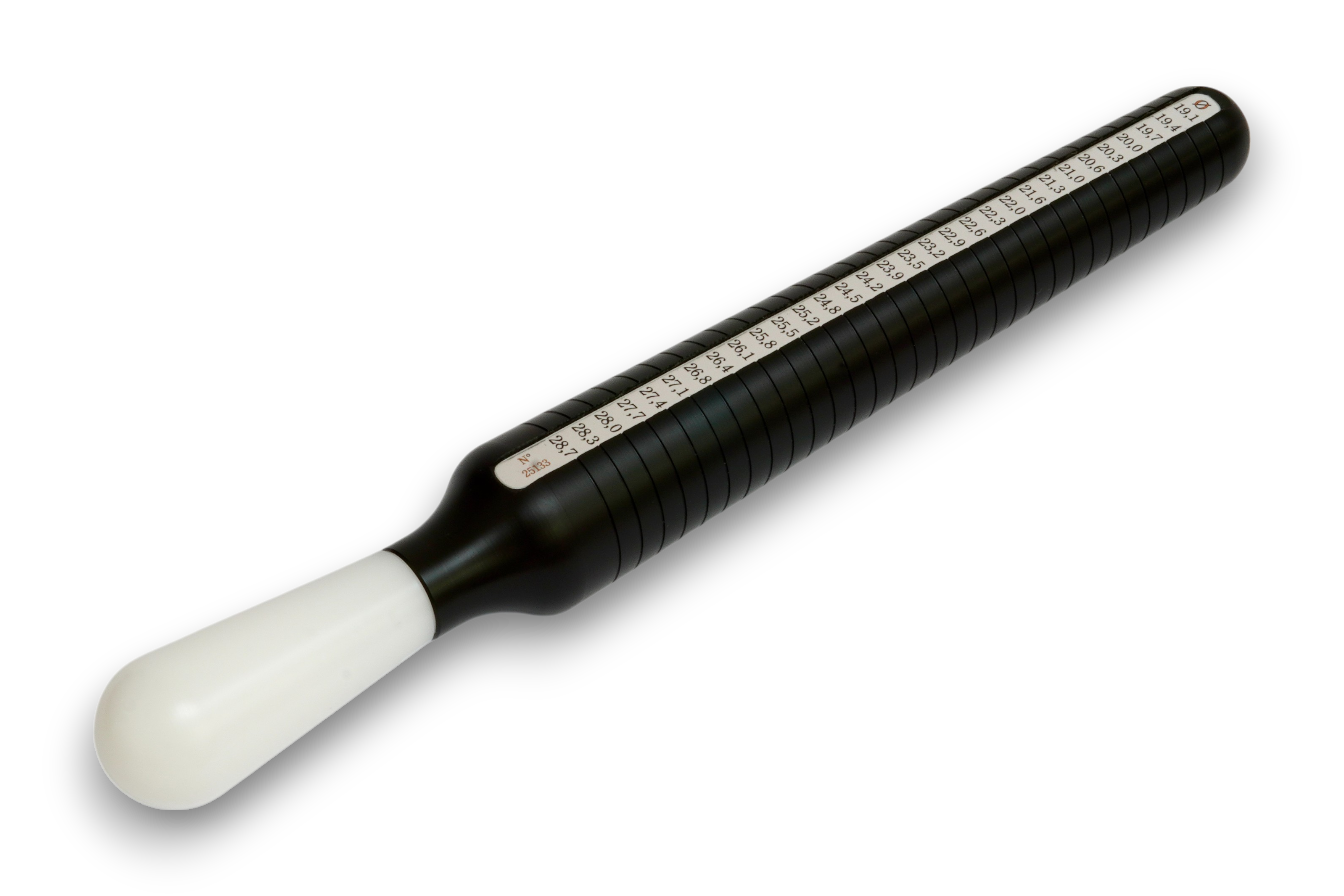 Jeder Ringstock ist mit einer gut ablesbaren Skaleneinteilung versehen, die sowohl die Ringgröße als auch den entsprechenden Durchmesser anzeigt. Der schwarze Messdorn sorgt in Kombination mit dem weißen Griff für einen deutlichen Kontrast und eine komfortable Handhabung.
